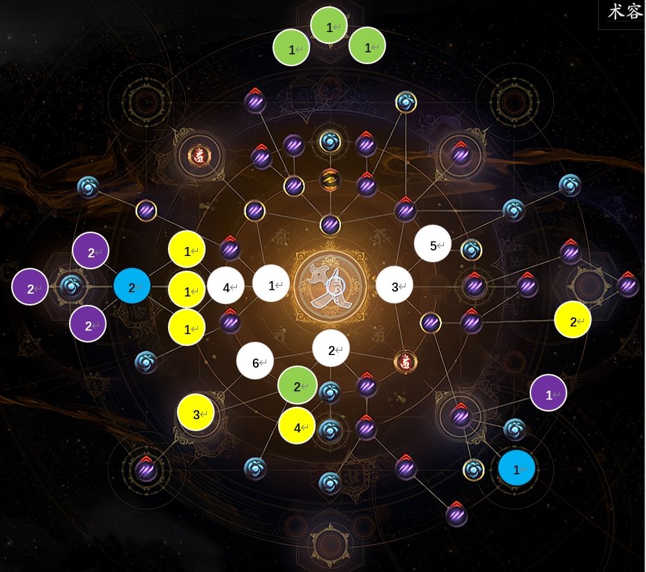 首先說明,我手動將術分爲五中顏色:白黃藍紫綠(對應裝備品質),分別代表初始即可學習,需要通過初傳,中傳,奧傳,以及boss掉落獲得。