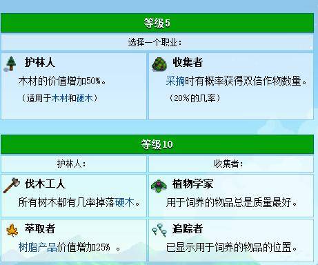 護林人:① 伐木工人(所有樹木都有幾率掉落硬木)②萃取者(樹脂產品價值增加25%)