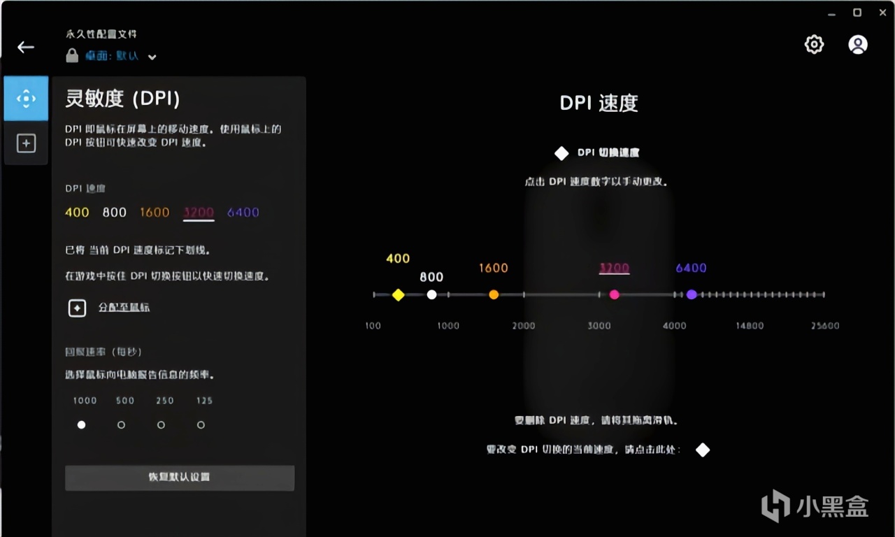 點進去以後可以自由的選擇dpi值以及鼠標的回報速率,dpi的設置更加的自由除了默認的400 800 1600 3200 6400等檔位以外,右側的窗口還可以自由的進行設置數值