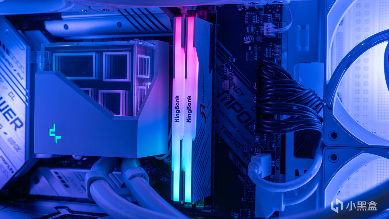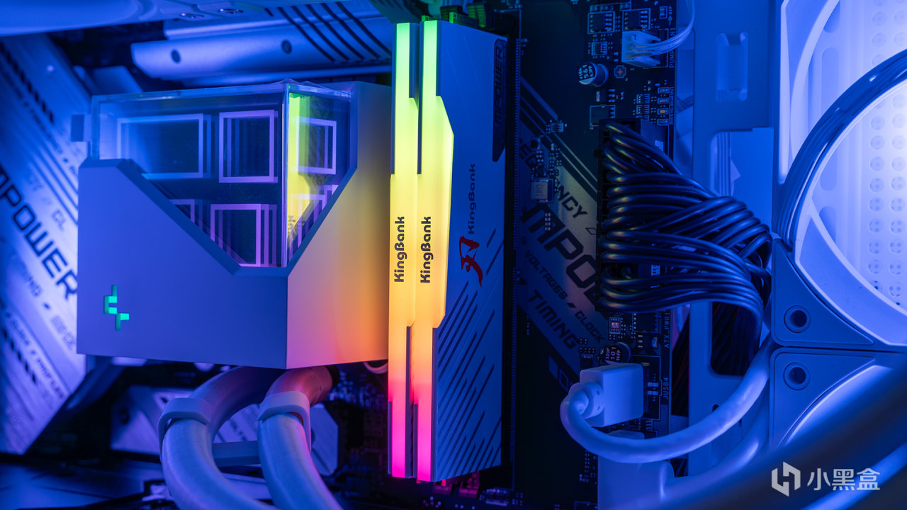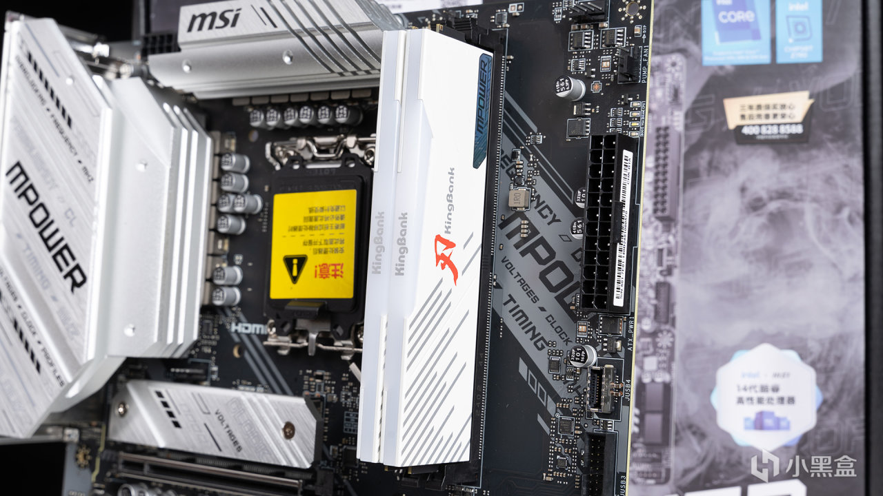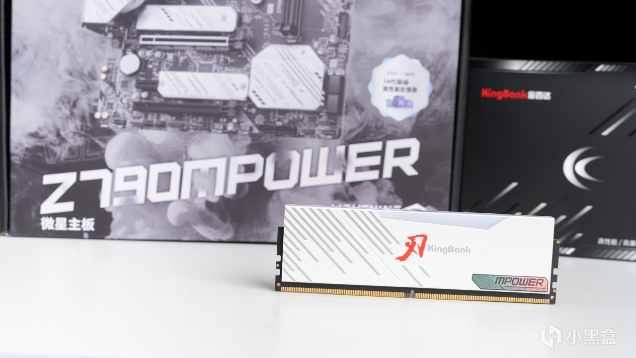内存安装在微星Z790 MPOWER上的样子,顶部是带KingBank LOGO的RGB导光条,内置了16颗LED灯珠,支持各大主板灯控软件,并且本身导光条和散热马甲是保持一致的乳白色设计,整体观感更好。