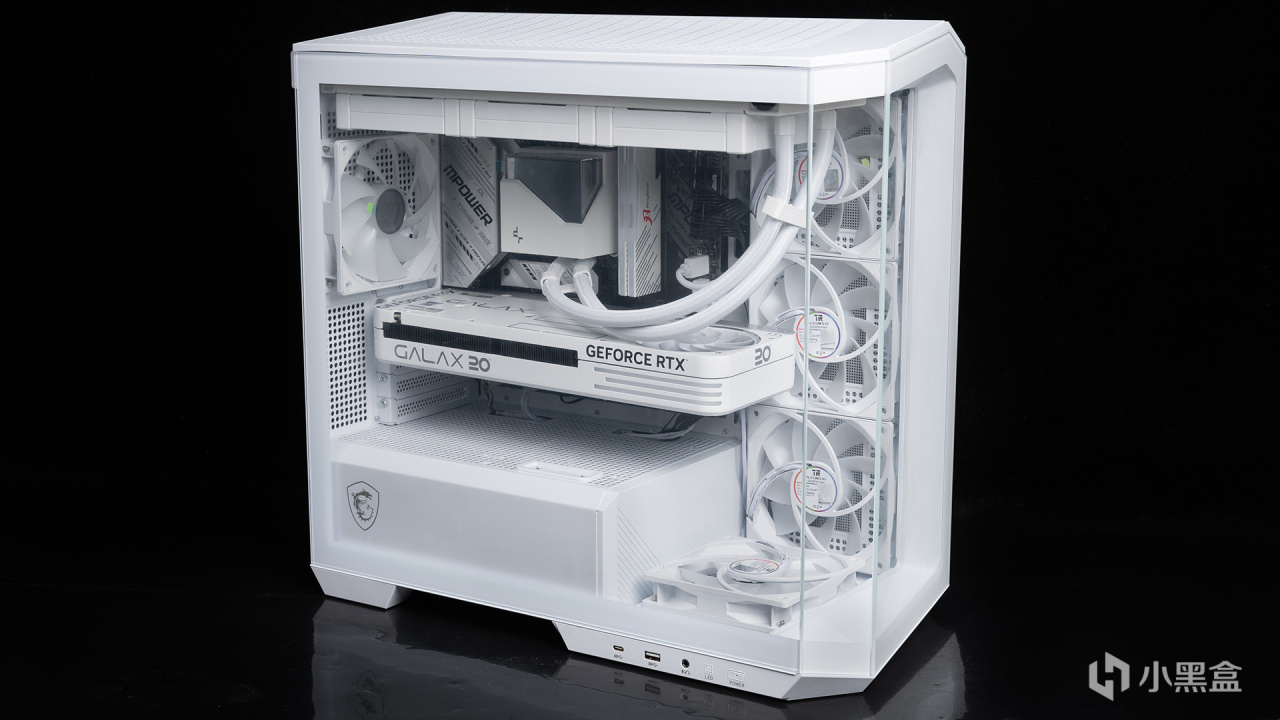 为了模拟实际使用场景,本次使用微星MAG PANO M100L PZ白刃,机箱采用双面侧透玻璃设计,形成视角很通透的海景房,除了常规正插以外,内部还支持MATX背插主板,支持五个方位的风扇安装(本次测试会额外对内存加装风扇),另外一些细节也挺不错,比如一体式电源键跳线、配备显卡支架、免工具拆装等。