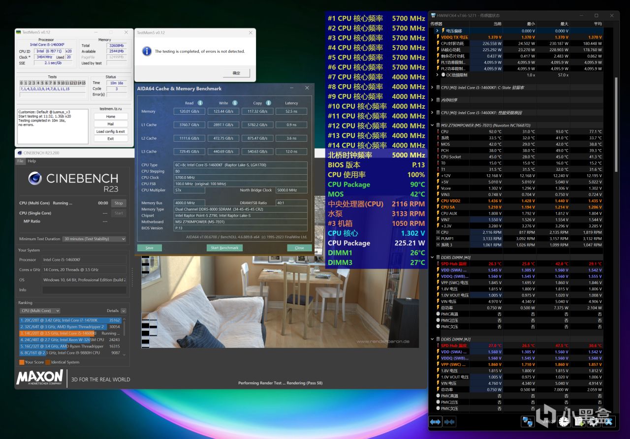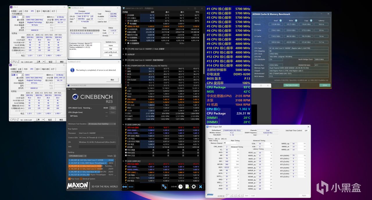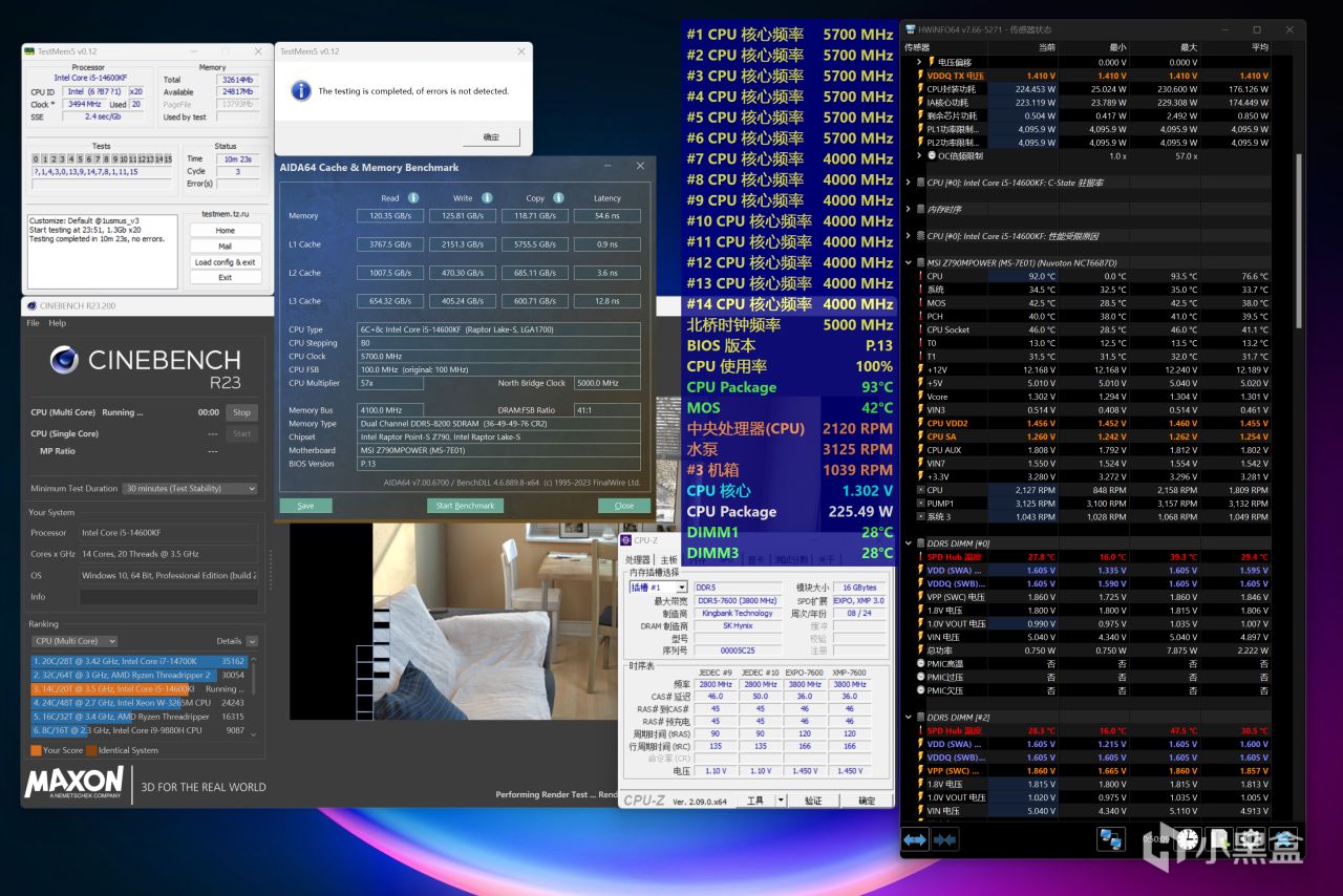 手动超频达成的DDR5-8200C36频率,第二天又进行了复测,在1.25V的SA电压下是无法通过烤机的(出现少量报错),而在加了0.01V之后,甚至稳住了压力更大的TestMem5 Extreme@anta777配置烤机,历时1小时19分钟无报错通过,30分钟的Cinbench R23多核烤机依旧也没有问题,接下来玩了几天游戏并没有出现异样。至于内存烤机时最高温度会稍高了一丢丢,所以说手动超频内存一定得要风扇辅助。