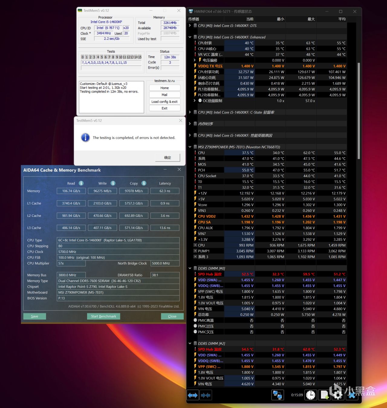 首先来看看内存XMP超频预设的表现,也就是达成DDR5 7600C36,在微星Z790 MPOWER上完美通过10分钟TestMem5 1usmus_V3配置烤机测试,基本上就能断定兼容性没有问题,毕竟内存也是通过了QVL认证,烤机时在无任何风扇辅助情况下,内存温度达到60℃,在同类产品中还算出色,要知道高频DDR5本身发热量就不小,加上主板是双槽设计,两根内存是紧挨着的。