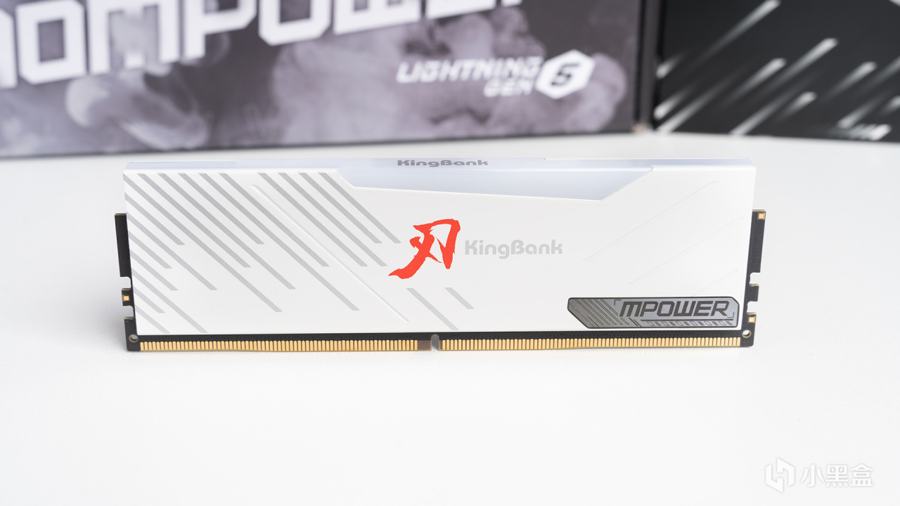 金百达白刃RGB DDR5 7600外观看上去是相当靓丽,由单片2mm厚度打造的铝合金马甲,表面覆盖了釉白烤漆工艺,大大的红色“刃”字在白色背景下尤其搭衬和抢眼,侧面视角也能看到一部分灯条。在内存右下方带有MPOWER的镭射标,有光打到时会呈现彩色效果。