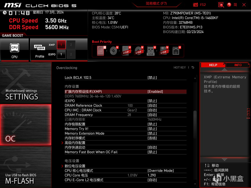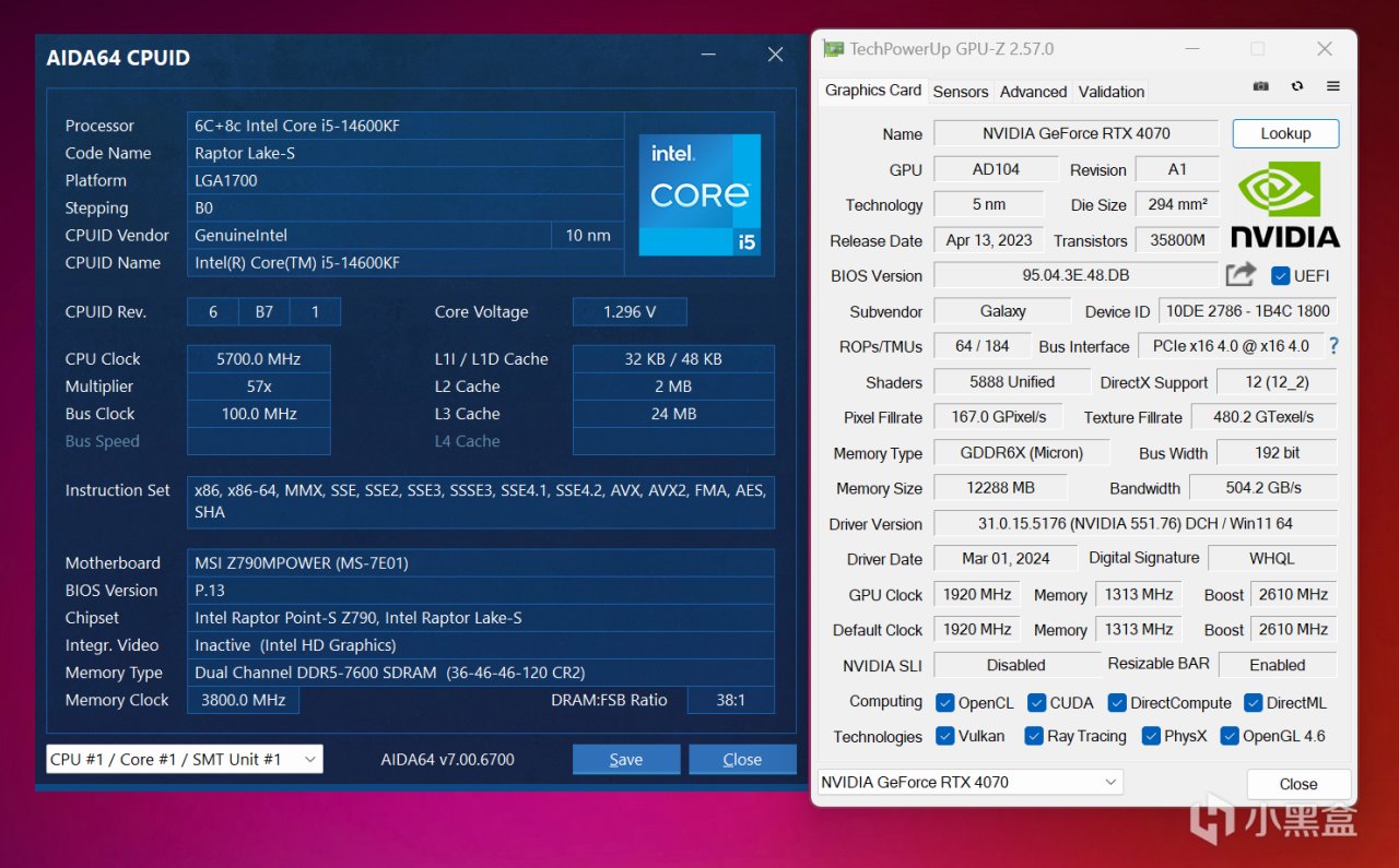 进入系统实际显示核心电压为1.3V,先直接开启XMP状态,显卡为影驰RTX 4070 20周年纪念版,操作系统是最新Windows 11 23H2,搭载NVIDIA驱动是551.76 Game Ready WHQL最新版本,并在BIOS中开启Resizable BAR技术以便最大化显卡性能,它的存在主要是为了后续环节的游戏测试。测试时大概室温为24℃,湿度达到80%+,南方可难受了。