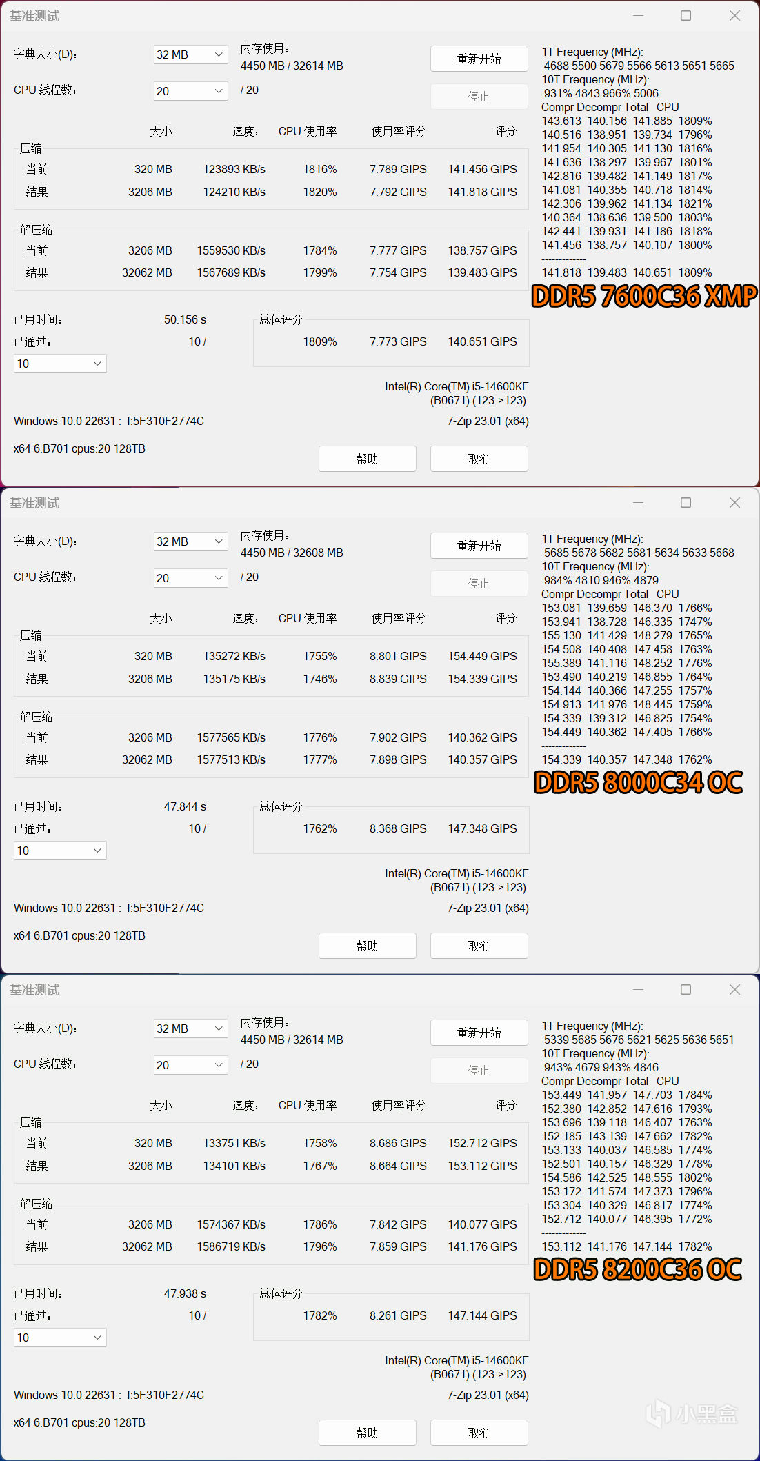 三种内存超频状态下7-ZIP基准测试,解压缩三者区别并不大,最多也就提升1%,这是因为该项目主要影响因素是CPU本身规格,在压缩性能方面,DDR5 8000C34相比XMP提升8.8%,DDR5 8200C36相比XMP提升7.9%,还算挺明显的幅度,反映在日常使用中可以缩短压缩时间。