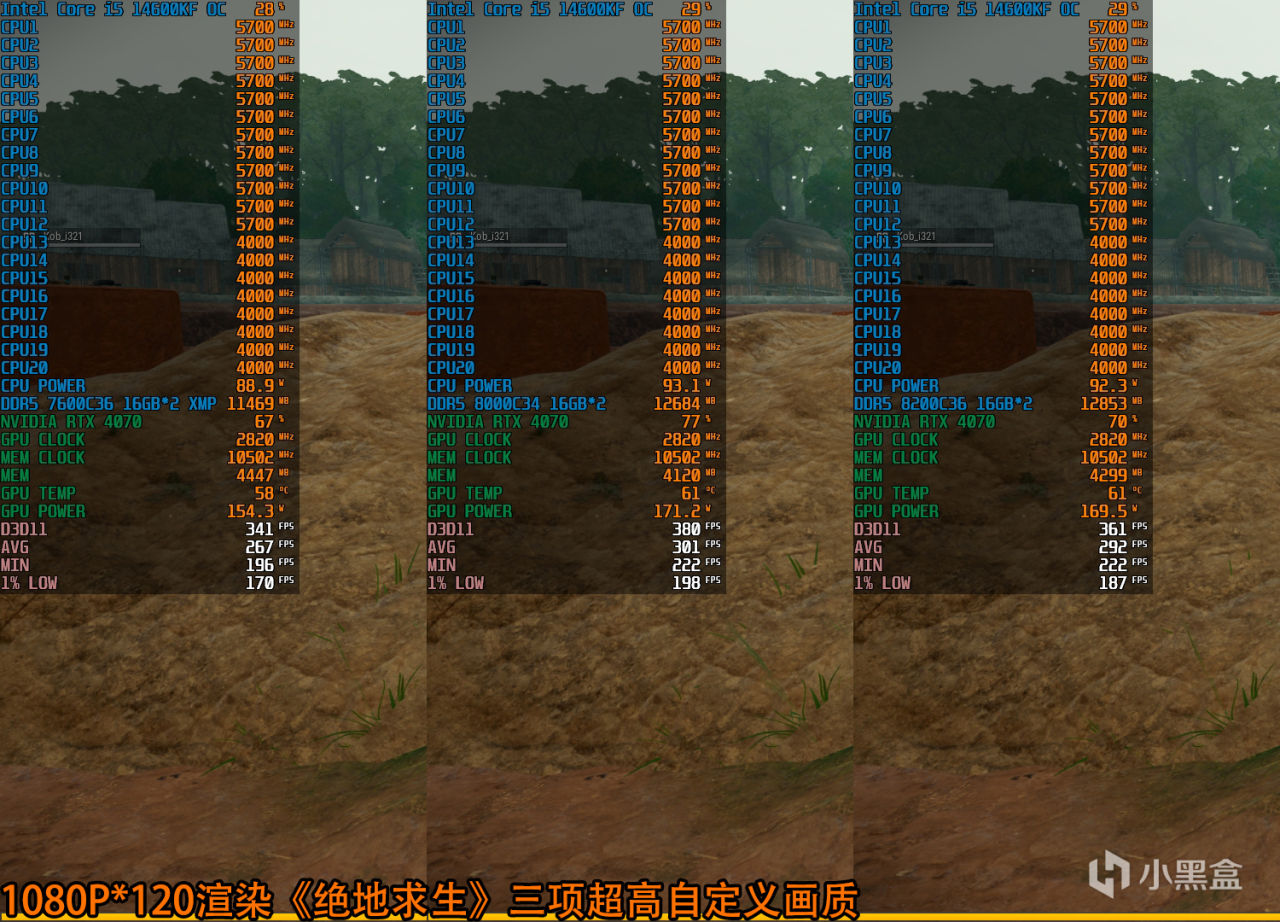 最后游戏测试还是通过《绝地求生》验证一下,XMP状态下,这套板U内存显卡组合已经可以达成1080P分辨率平均267fps的表现,DDR5 8000C34相比XMP再提升12.7%,而DDR5 8200C36相比XMP再提升9.3%。