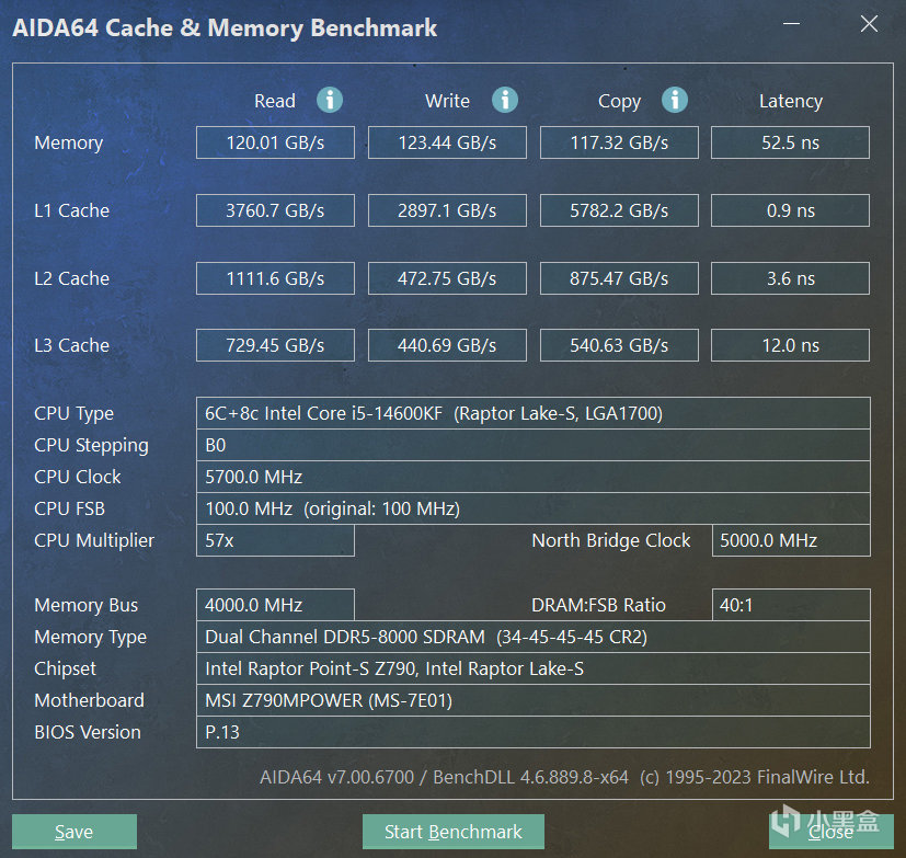 金百达白刃RGB DDR5 8000C34手动超频,AIDA64内存和缓存测试