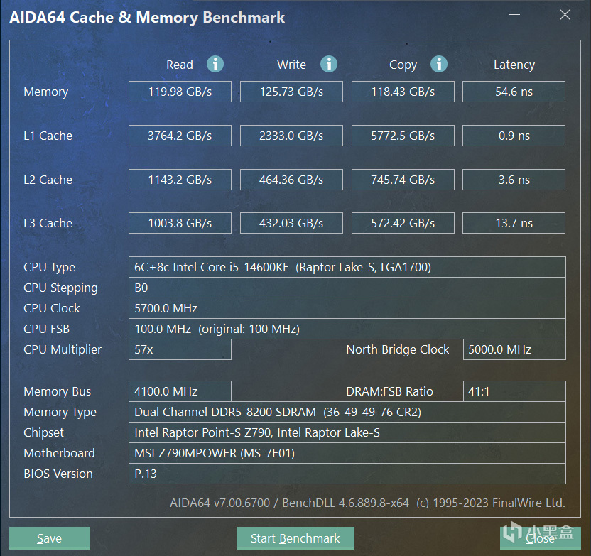 金百达白刃RGB DDR5 7600 XMP超频,AIDA64内存和缓存测试