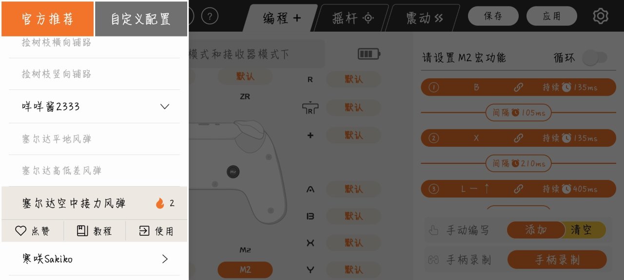 按压反馈很不错,并且链接APP之后,用预设的一键飞雷神,高低差风弹简直提升了我的海拉鲁恶霸之旅,反正对于我这种平地风弹搓不出来,空中风弹十次难成九次,高低差风弹勉强能使出来的玩家来说,爽!