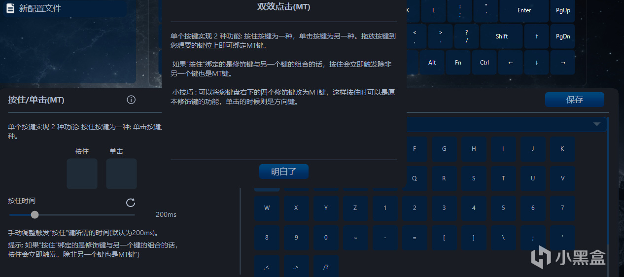其他的两个功能则为锦上添花的作用了,实际上对于竞技游戏来说提升并不算很大,反而对于偶尔使用到别的按键的用户较为友好。拿其中的MT功能举例,这个功能可以实现同一个按键的“按住”和“单击”实现两个功能,也可以简单设置为单击为“W”,长按为“S”的简单操作(仅举例),对于小配列键盘为数不多的按键来说,这个功能无疑很好用。