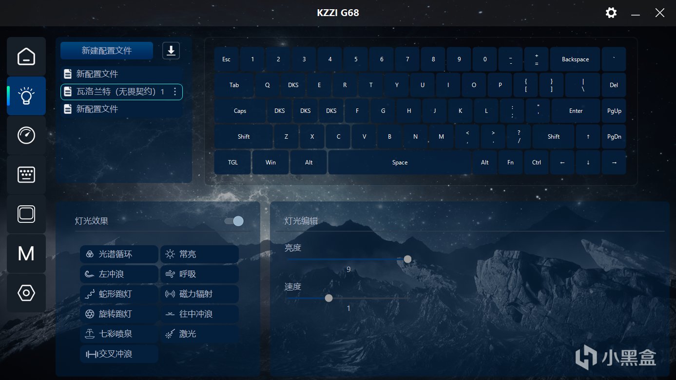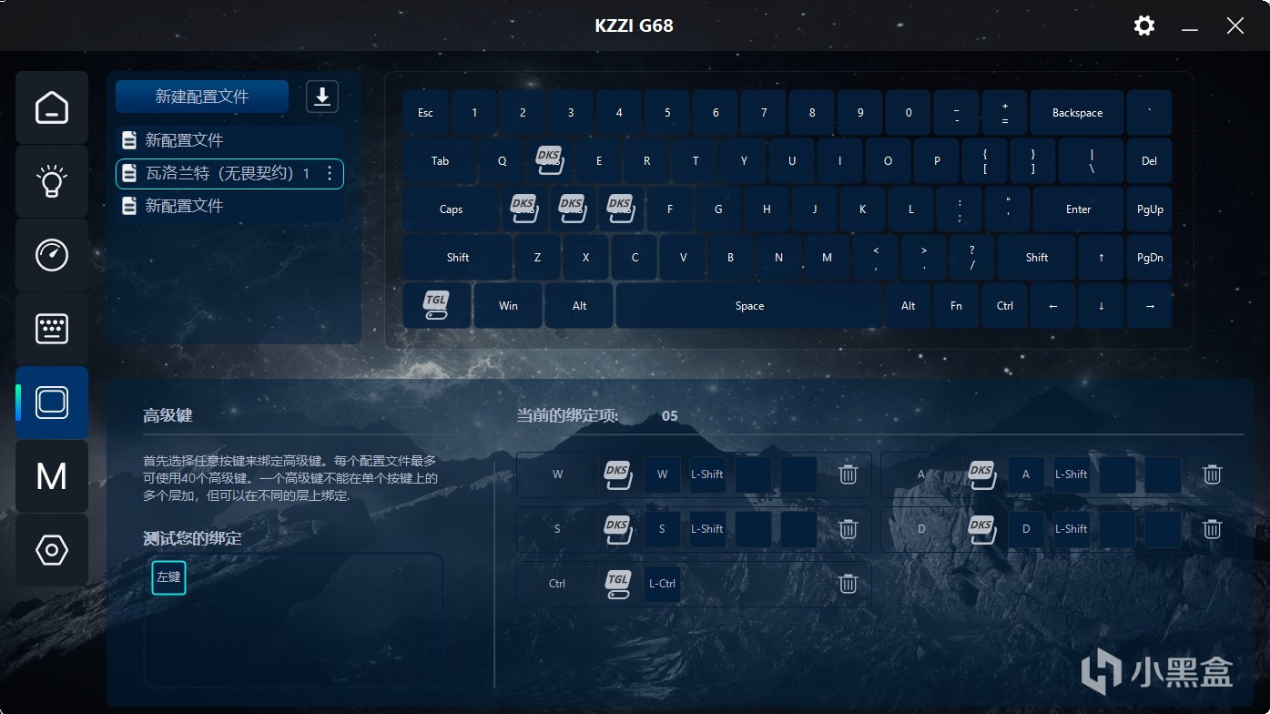 驱动整体的功能还是非常完善的,基础的改键、RGB灯效调整、宏功能都是有配备的,磁轴最重要的RT等功能也是放在最显眼的地方。作为和磁轴配合最好的游戏之一——瓦洛兰特,珂芝这款驱动直接内置了瓦的配置文件,可以在第一时间享受到磁轴的快乐。