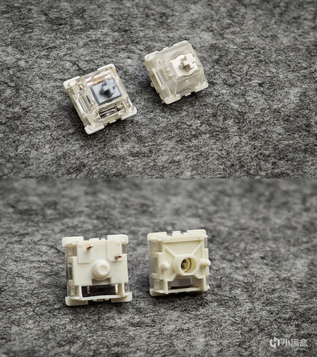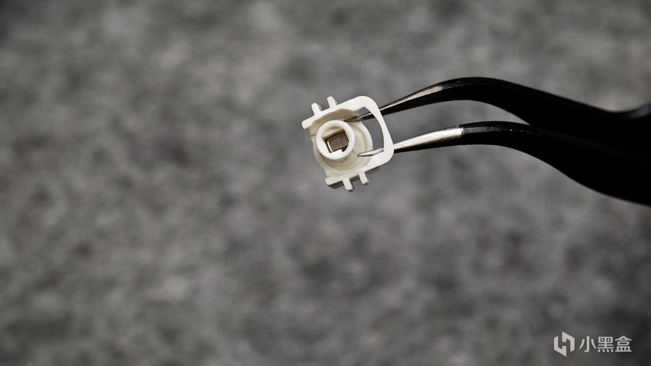 在大致外观上磁轴和机械轴体并没有太差差异,主要差别是在底部,可以看到磁轴相较于机械轴体,去除了针脚,将中心处开了一个孔洞,透过孔洞还能看到轴芯上的磁铁,这也是磁轴的触发原理了,通过轴芯处的磁铁以及PCB处的感应器,以及在软件上的设置,从而让键盘识别按键该在什么地方触发,在哪里复位,大体上就是这么个意思。