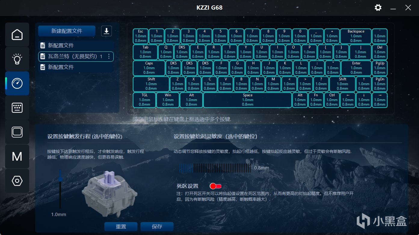 除此之外也是可以单独对每个按键进行自定义设置。像是基础的RT,珂芝这款驱动支持最低0.1mm触发,算是目前的第一梯队了,同时抬起复位点也可以设置到最低抬起0.1mm复位,不过为了防止断触概率发生,珂芝为这个功能添加了一个死区设置(也可以看成风险预警),在开启死区后最低只可以设置为0.6mm,不过断触的风险大幅度降低。