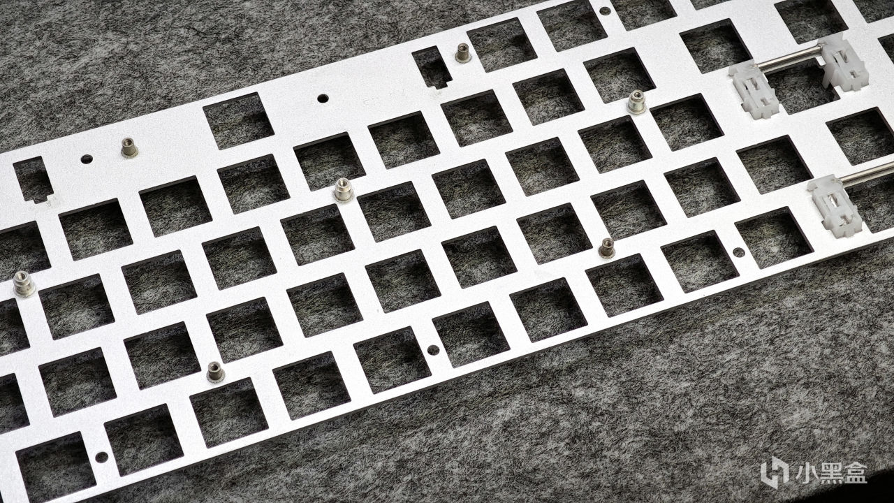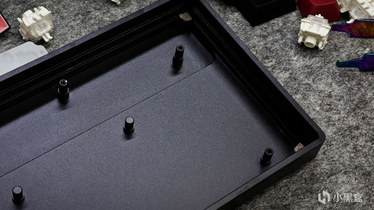 底壳同样是采用了全CNC的铝合金材质,整体的质感相较于塑料键盘来说会有明显提升,这也是目前客制化键盘中几乎都在使用铝合金作为外壳的原因之一。在内部可以看到相当多的限位柱,可以防止内胆在键盘中漂移,在四个角落处也可以看到做了绝缘处理,防止“键盘咬人”事件发生。