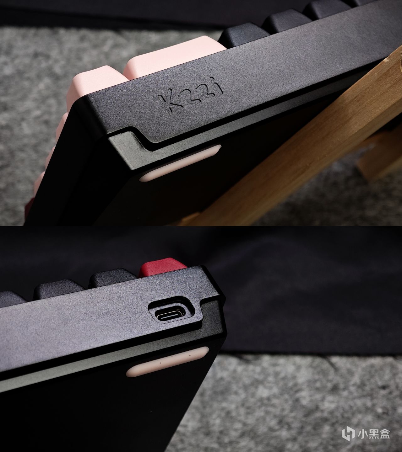 珂芝LOGO位于键盘后侧面,和Type-C接口各占一边,采用阴刻的工艺整体质感还算不错;另一边则是只有个Type-C接口,周围留有空间可以兼容航插线。