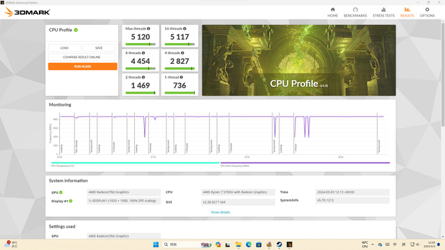 其次在CPU Profile的测试,CPU Profile开始后将运行6次,分别测试处理器的最大线程性能、16线程性能、8线程性能、4线程性能、2线程性能和1线程性能。8线程负载与目前绝大多数DirectX 12游戏有较高的相关性。最大线程得分为5120分,在八线程、四线程、四线程、双线程、单线程的的得分分别为4454、2827、1469、736。