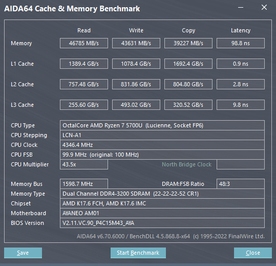 在Memory Benchmark测试中,我们得到以下数据。写速度为46785MB/s,写速度为43631MB/s,copy速度为39227MB/s。