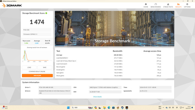 最后是关于SSD的测试项目Storage Benchmark,整体得分为1474分,数据和在CrystalDiskMark的测试数据相呼应。