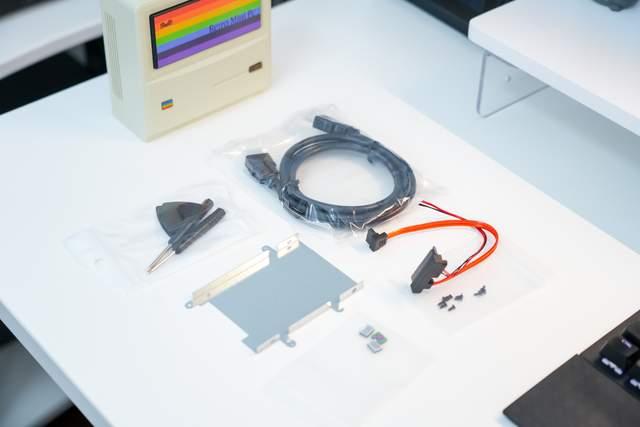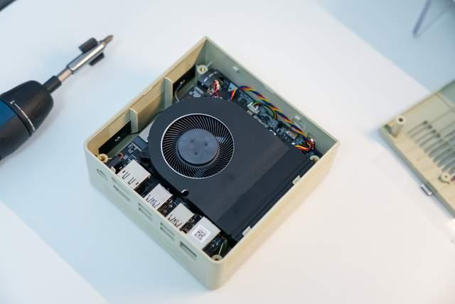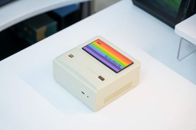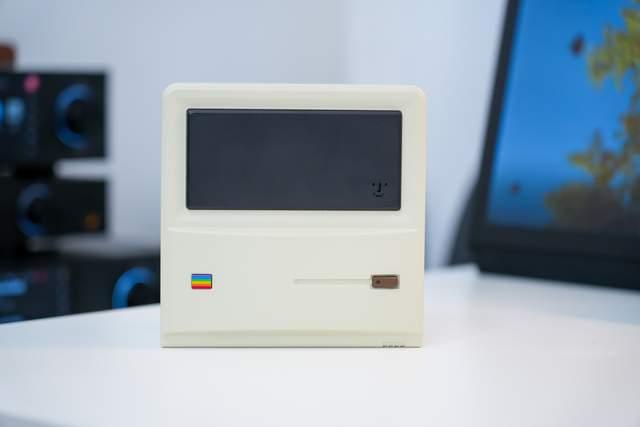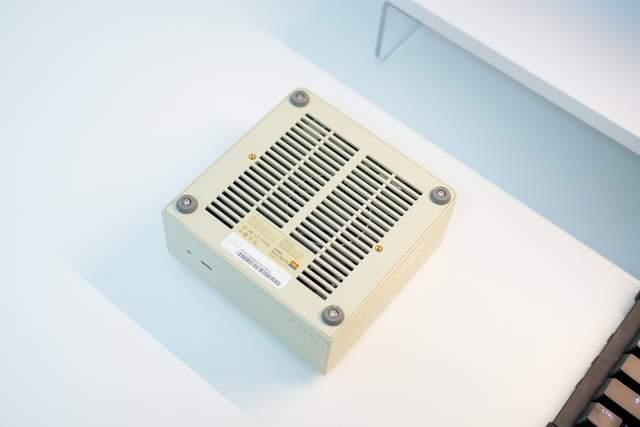 AM01因为在外观上致敬了经典的老苹果电脑,所以外观上设计的非常像苹果麦金塔,但是它并不是竖立摆放的,而是躺着的,所以还是个方方正正的小盒子,机身是塑料机身,配色也是还原了苹果麦金塔的配色。机身尺寸为132mm × 132mm × 60.5mm,体积达到了1L,体积很小。这样一来的话,整体主机就显得非常精巧和复古。另外,而那些多彩的装饰贴纸也算是一个乐趣,可以自由变换装饰。