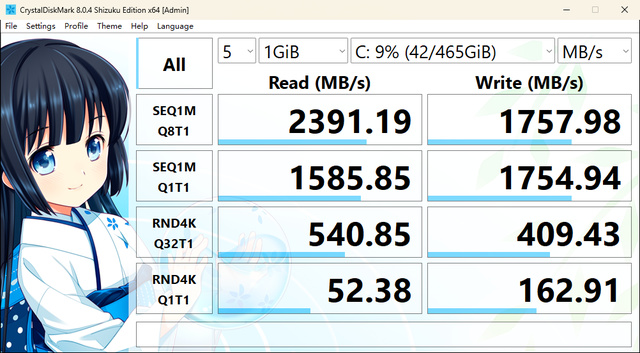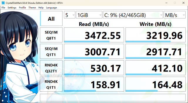 关于硬盘, AM01配备了PCIE SSD,容量为512G。我们通过CrystalDiskMark进行默认随机模式和全零可压缩状态模式这两种模式的测试,测试结果如下图,在默认随机模式下得到读取速度为2391MB/s、写入速度为1757MB/s 。在全零模式下得到读取速度为3472MB/s,写入速度为3219MB/s。