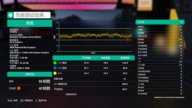 首先我们测试的游戏是极限竞速:地平线4,画质设置为三高最终测得40帧的成绩,属于能玩的水平。相信如果降低画质,帧数还能有提升空间。