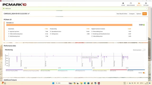 来到最激动人心的生产力测试部分,本次生产力测试我们是使用PCMark作为测试软件,CMark是一款由Futuremark公司开发的基准测试软件,它主要用于测试计算机的性能和稳定性。PCMark通过一系列的测试来评估计算机的整体性能,包括启动速度、应用程序响应速度、图形性能、硬盘读写速度等多个方面,从而为用户提供一个全面的性能评估结果。综合得分为5031分。其中,基本任务得分为7753分,生产率得分为7918,数字内容创作得分为5629。