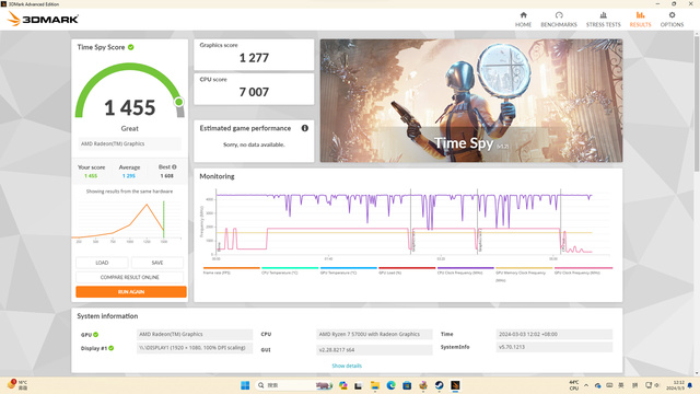 作为游戏性能的理论测试的业界标杆,本次测试使用3Dmark进行测试。我们选取了三个项目,他们分别是Time Spy、CPU Profile、Storage Benchmark.首先是Time Spy的表现,总分为1455,而单独得分里,GPU得分为1277,CPU得分为7007。