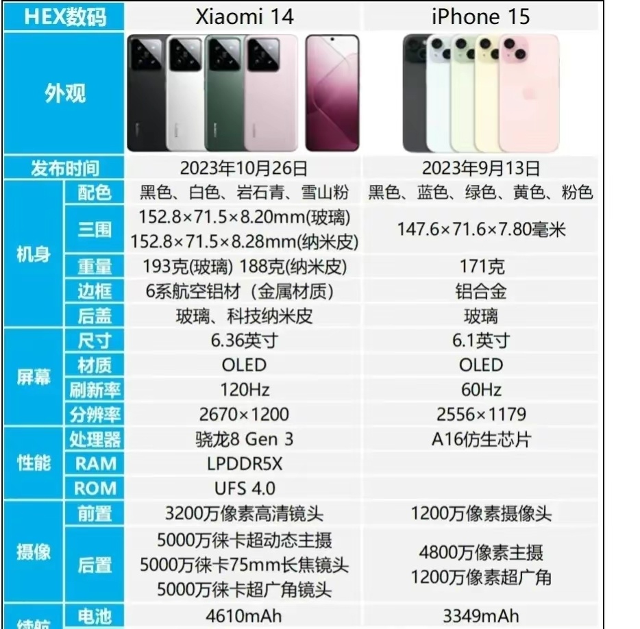 分辨率折算後小米14的450ppi和iPhone15的460ppi差距可以忽略不計。(而即使只有1080p分辨率的鑽排小屏機型,實際對比清晰度差距不大)