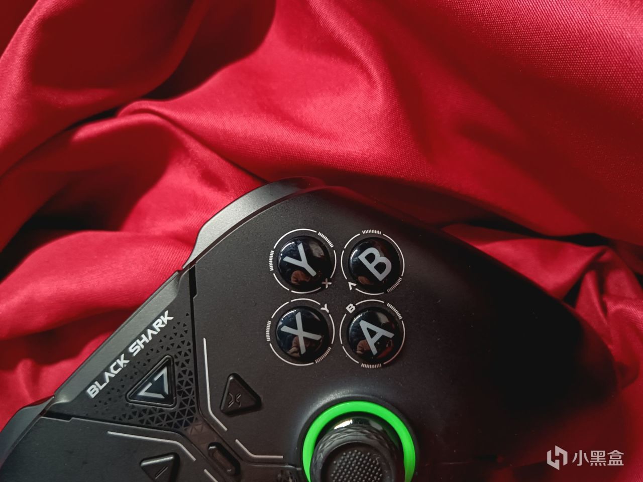 首先就是手柄外观,通体黑色,手柄正面中间是做了一些纹样设计,划分的区域还是黑鲨手机背面的那个经典的味道,Home键是一个透光的logo,Home键上方也是有着“BLACK SHARK”的银色字样,设计很有感觉,一看就知道是致敬黑鲨1代,有些人可能觉得丑,但我可能是有当时对黑鲨1代爱而不得的缘故,我觉得还是蛮好看的。