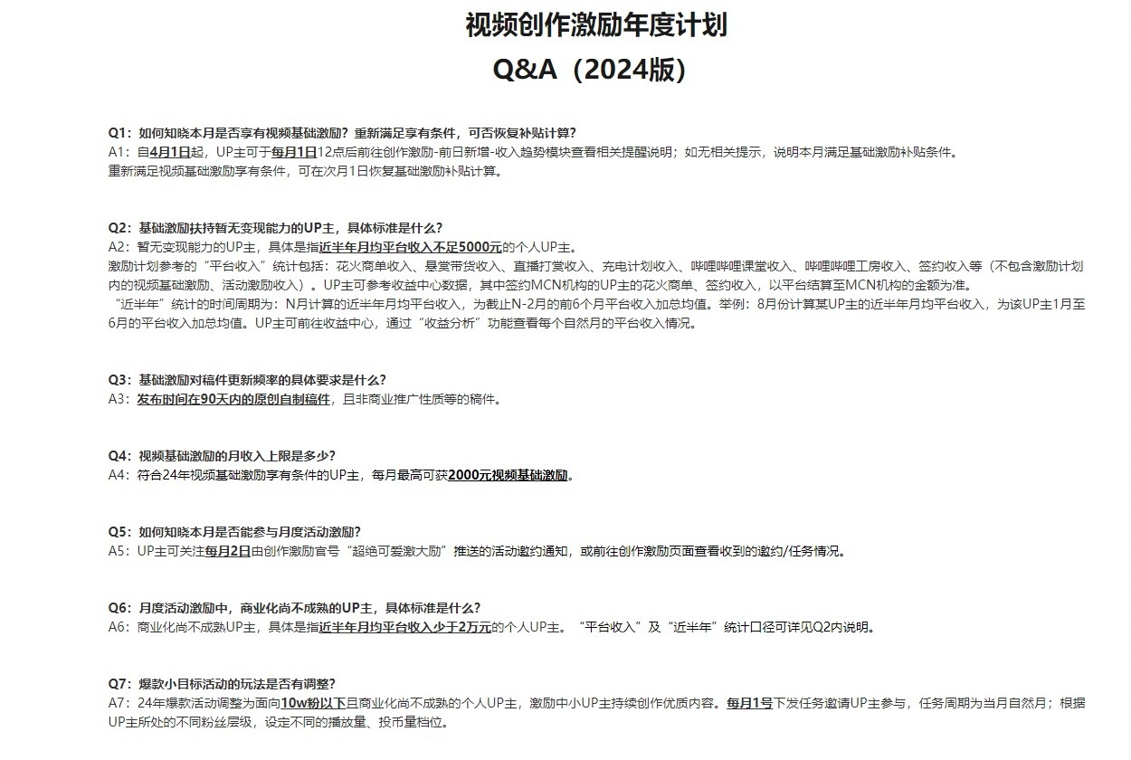 視頻創作激勵年度計劃Q&A(2024版)7條內容,簡單概括下。