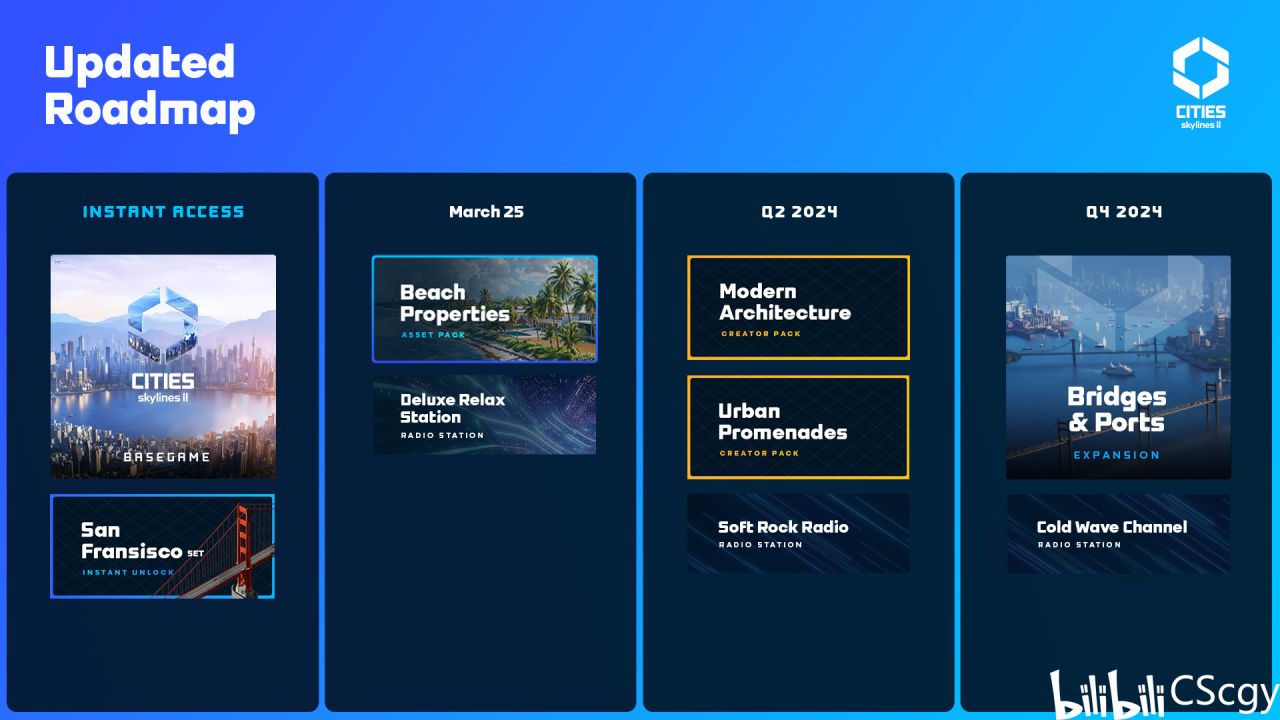在2024年3月25日(北京時間2024年3月26日約0點),城市天際線2的首批兩個dlc:海灘資產包(Asset Pack: Beach Properties)和豪華休閒電臺(Deluxe Relax Station)將正式開售!