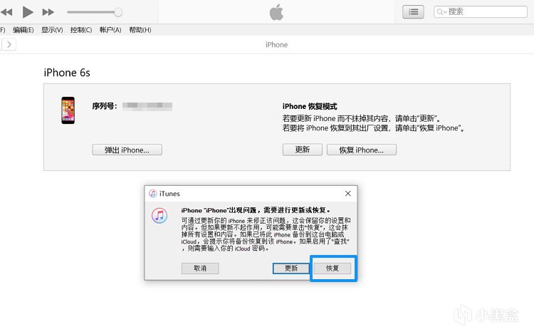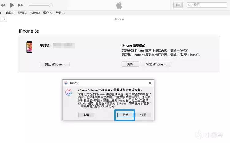 - iTunes将提示iPhone出现问题了,并提供“还原”或“更新”的选项。