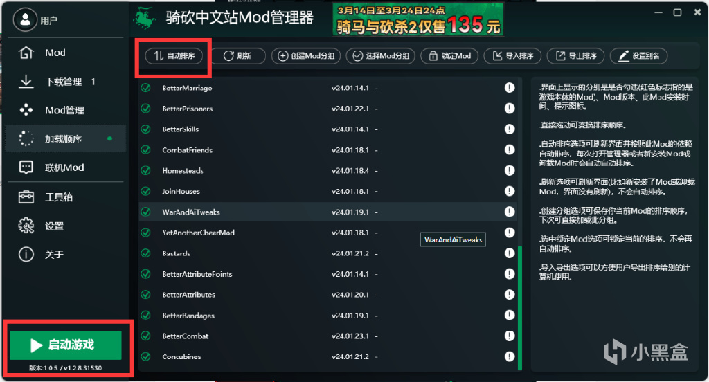4、在加載順序選項中,點擊自動排序後再點擊啓動遊戲即可進入Mod