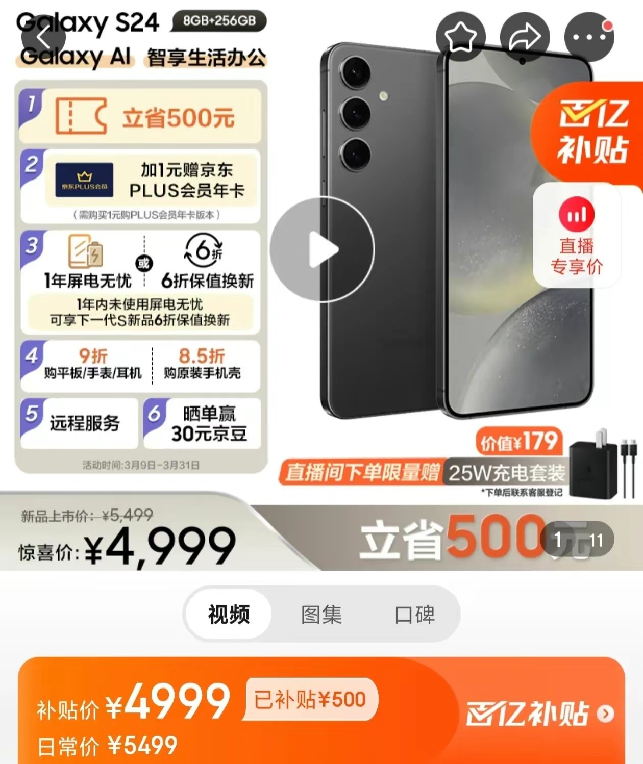 剛開始8+256G起步價5999元,後來…先行者購機權益減500,再後來就…再退500,爲什麼再退500呢,因爲三星最終定價在5499元,再加上購機優惠500,總共減了1000元,最終還需要付4999元。