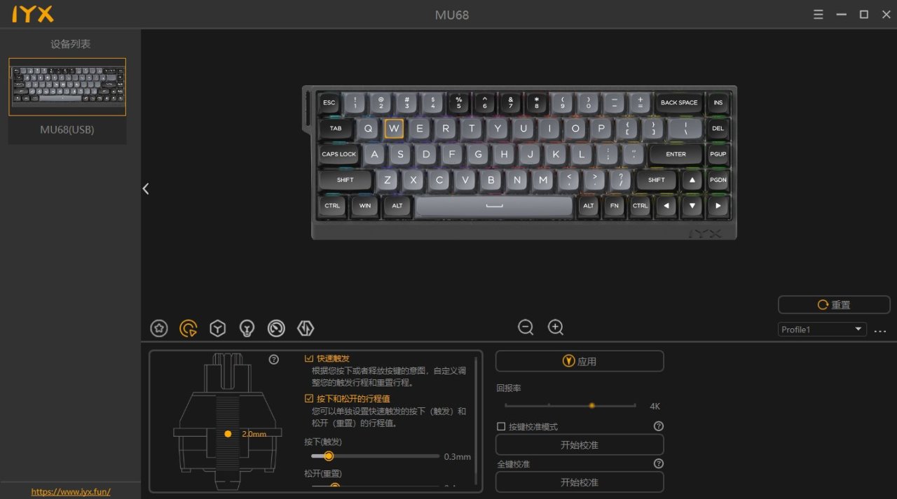 最后的最后就是调试了,进入官方网站,下好驱动后,你可以自行更改按键的建成最小额为0.1,最大是3.8mm,这边要说一下,如果你刚开始就调到0.1或者到0.2。你可能会不太习惯,然后断触,这边建议是慢慢来,慢慢往上升。除了RT功能外,还可以调节键盘的回报率,最低1K,最高8K,延迟方面更是低于0.125ms,这回你要是还菜,那就不要怪装备了。