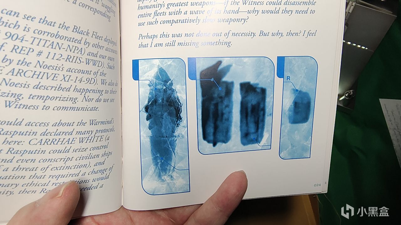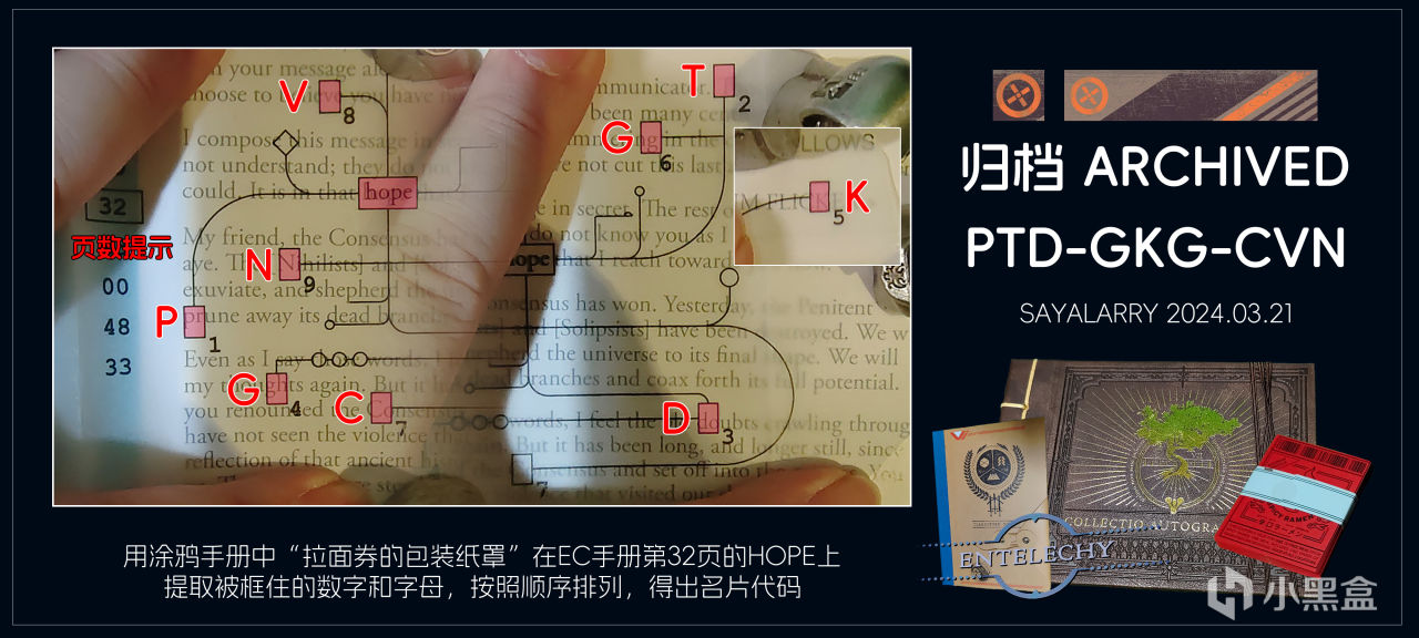 同時在另一本機密手冊中,可以找到一本藍色的書,他的右下角有頁數顯示。那麼,我們根據提示找到第32頁,把“拉麪券包裝”上的 HOPE 與這面中的HOPE對齊,就能發現封面的9個框,剛好各自框到一個字母,按照順序排列,就是歸檔名片的代碼“PTD-GKG-CVN”