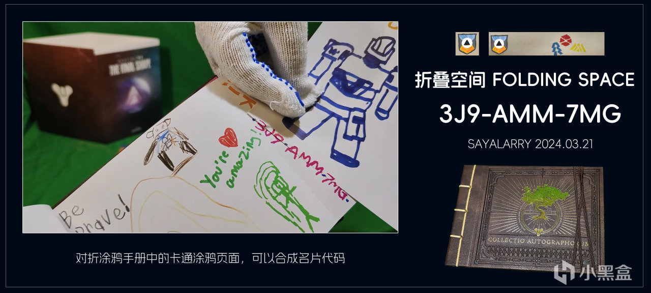 解密過程:需要在這本充滿塗鴉的手冊中找到卡通活頁,可以發現頁邊和其中某處,有紅色的疑似數字的標記。把他們彎曲對齊,就是摺疊空間名片的代碼“3J9-AMM-7MG”