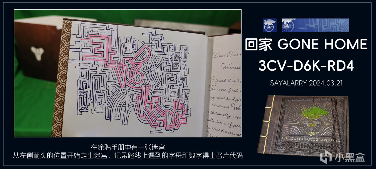 解密過程:同樣在塗鴉手冊中,第一頁有個迷宮,一眼看就可以看出這裏面有個數字6,如果我們順着左上角箭頭的提示走完整個迷宮,就能把所有的數字和字母串起來,把他們按照經過的順序排列好,就是回家名片的代碼“3CV-D6K-RD4”