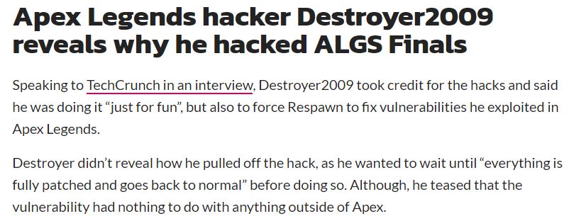 文獻參考:https://www.dexerto.com/apex-legends/apex-legends-hacker-claims-algs-hacks-were-just-for-fun-2602917/ Apex Legends hacker claims ALGS hacks were “just for fun”