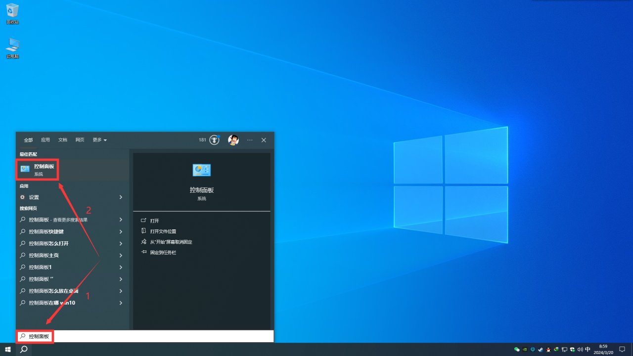 搜索栏搜索:控制面板-打开