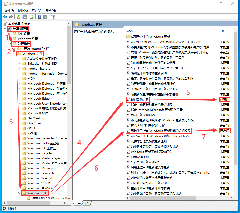 依次点击:计算机配置-管理模板-Windows组件-Windows更新(配置自动更新-双击选择禁用-确定)(删除使用所有Windows更新功能的访问权限-双击选择启用-确定)。