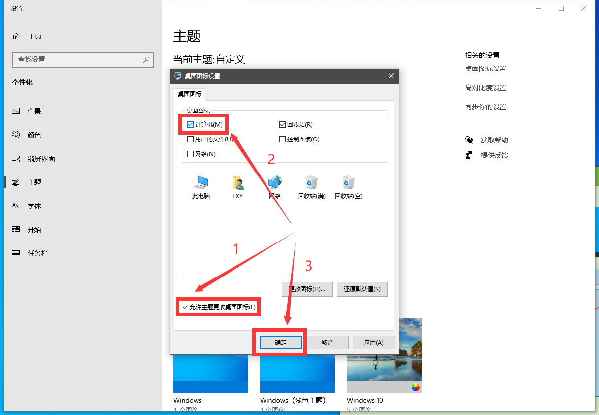 勾选“允许主题更改桌面图标”-勾选自己想显示的图标-确定