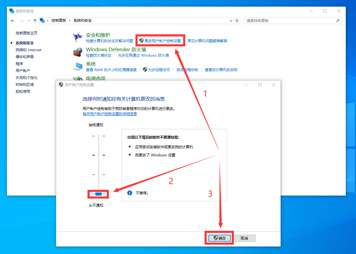 更改用户账户控制设置-拉到最低-确定(防止每次打开软件都警告提示)