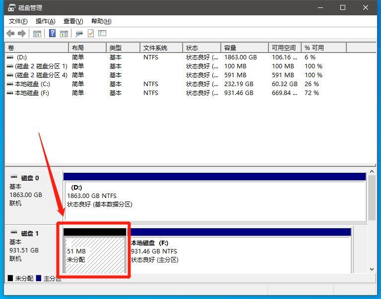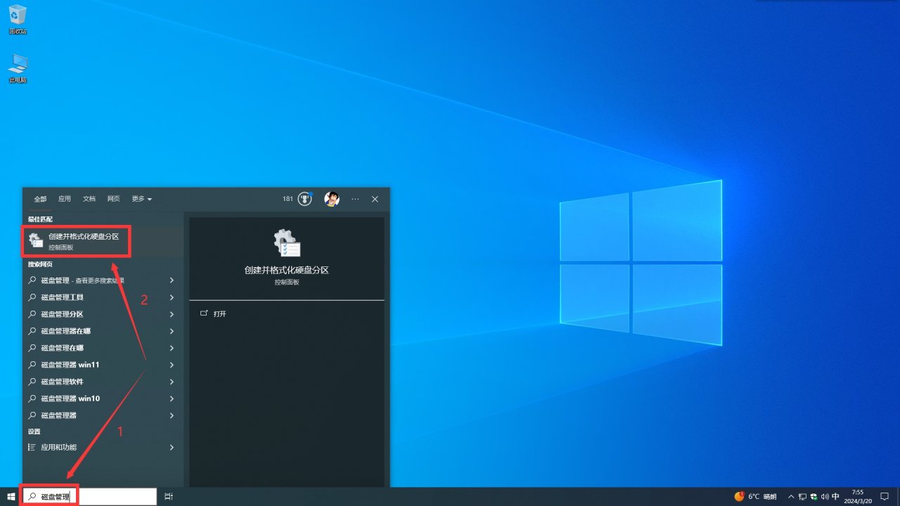 搜索栏搜索:磁盘管理-打开