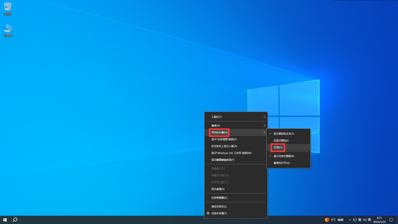鼠标右击任务栏-咨询和兴趣-关闭
