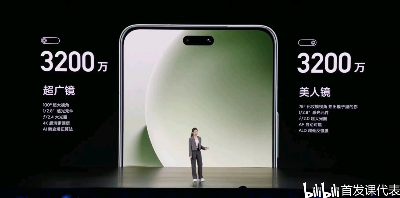 ◆ 前置:32MP 主攝(三星 S5K3D2,f/2.0,78°)+ 32MP 超廣角(三星 S5K3D2,f/2.4,100°),柔光環;