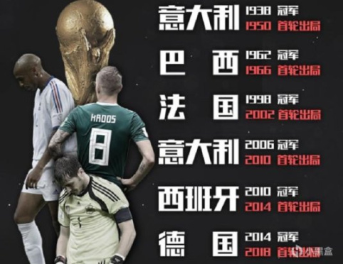 在约翰内斯堡捧杯的西班牙,在14年巴西世界杯小组赛出局;日耳曼战车德国队,在巴西加冕四星后,紧接着在18年世界杯里0-2不敌韩国,耻辱垫底小组赛出局!今年法国队内伤员不断,坎特、博格巴、恩昆库,再加上新晋金球奖得主本泽马,最后时刻因伤无缘世界杯......