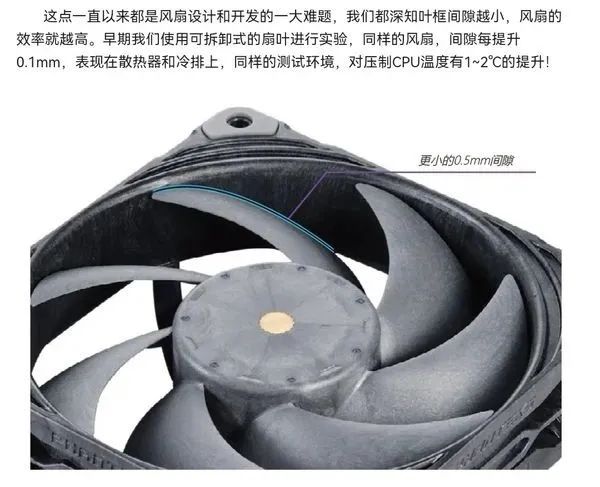 “框叶间距”,抑或“尖端间隙”,指的是风扇的扇叶末端与内边框的距离。如果对风扇性能的认知局限在扇叶的形状上,那恐怕不够全面——框叶间距对性能有着巨大的影响,有时甚至能够超越扇叶造型本身。