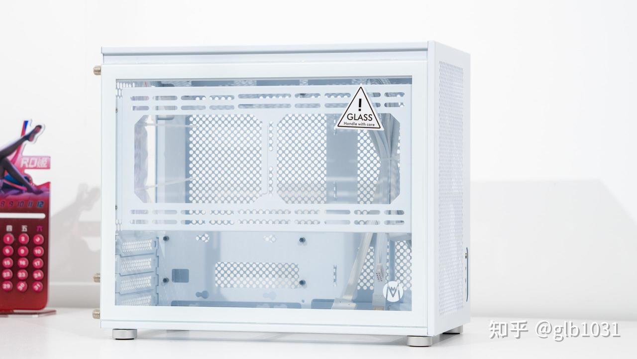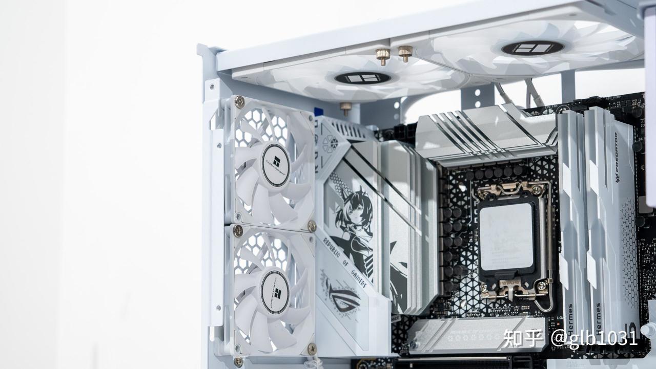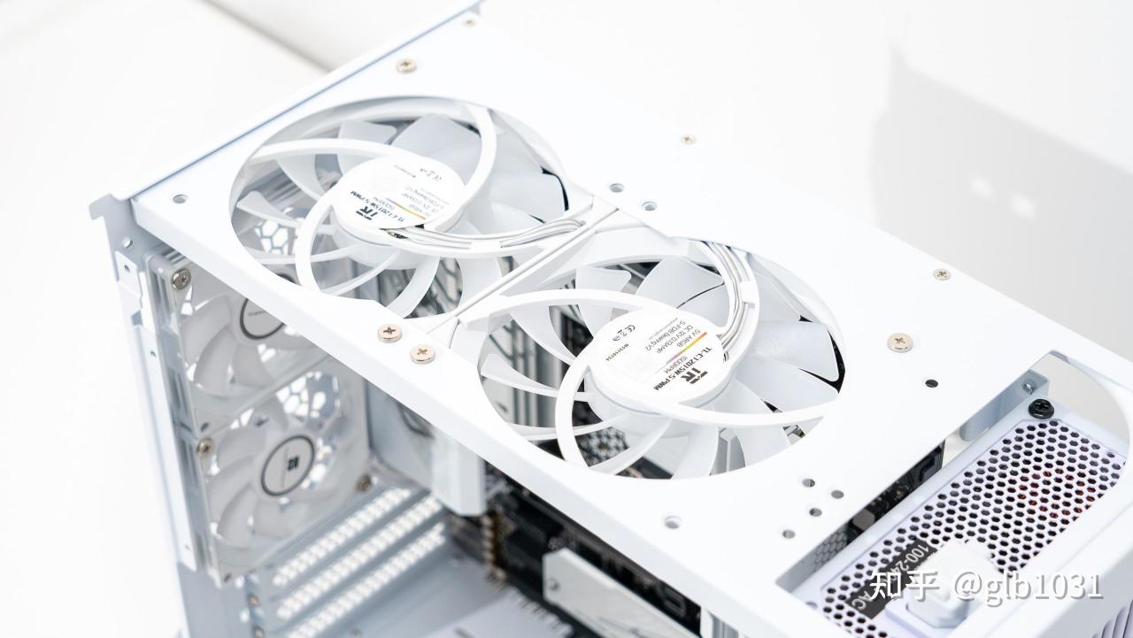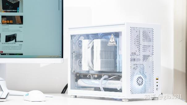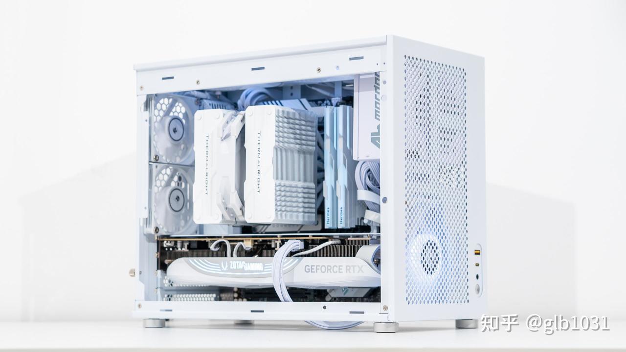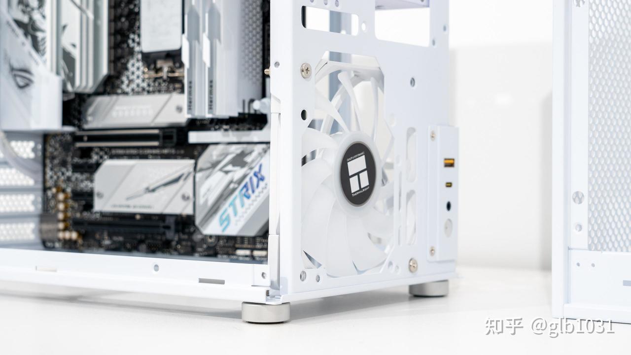 机箱左侧也安排了钢化玻璃面板,可以一眼窥探内部硬件。这里我选择了全白主机的装机方案,搭配了支持ARGB 的利民薄扇在帮助散热的同时作为点缀。